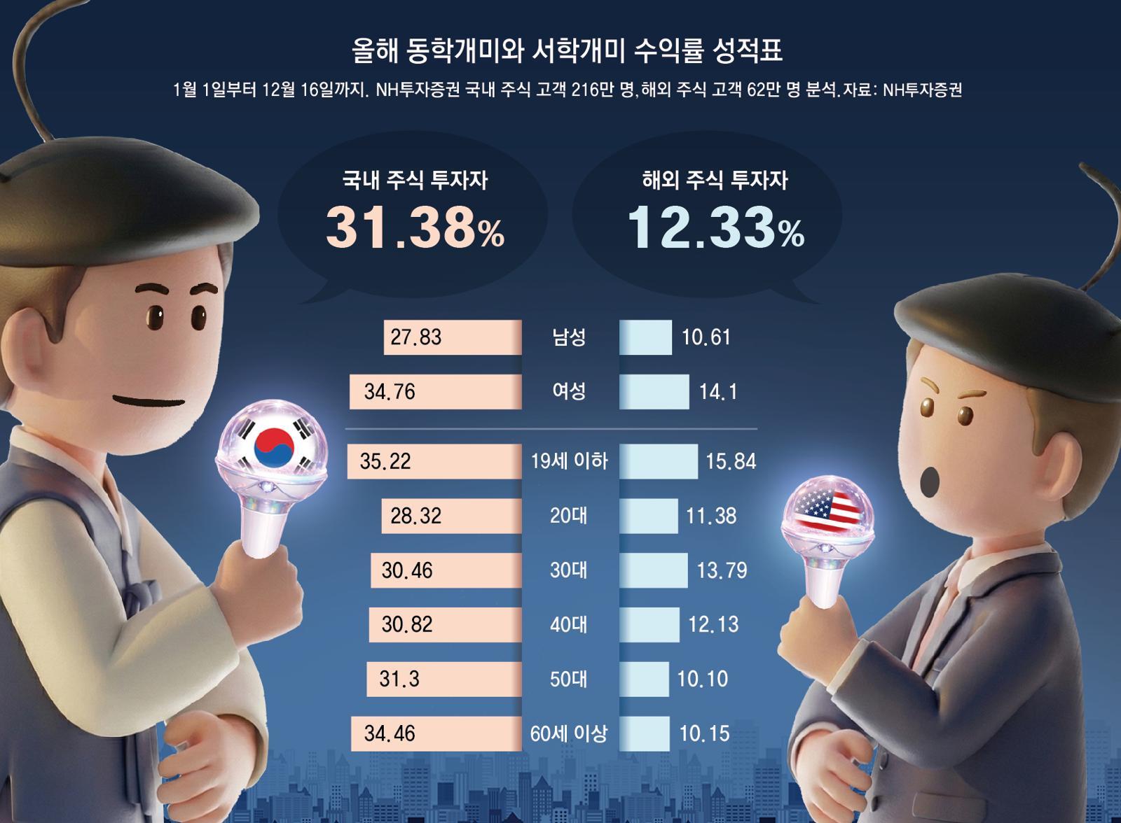 뜨거웠던 국내 증시의 영향으로 동학개미의 수익률이 서학개미를 제친 것으로 나타났다. NH투자증권이 올해 1월 1일부터 12월 16일까지 매수·매도가 이뤄진 국내 주식 투자 고객 216만 명과 해외 주식 투자 고객 62만 명을 분석한 결과 국내 주식 투자자는 31.38%의 수익률을 올렸다. 반면 해외 주식 투자자는 12.33%의 수익률을 올리는 데 그쳤다.