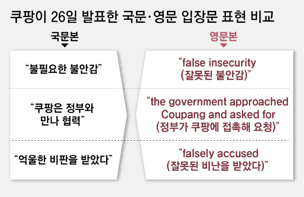 쿠팡이 26일 발표한 해명성 입장문 국문본과 영문본의 일부 표현이 다른 것을 두고서도 논란이 일고 있다. 국문본에서는 ‘불필요한 불안감’이 조성되고 있다고 표현한 것을 영문본에서는 ‘잘못된 불안감(false insecurity)’이라고 표현했다. ‘억울한 비판을 받았다’는 영문본에서 ‘잘못된 비난을 받았다(falsely accused)’고 썼다. 영문본만 보면 조사 결과에 의구심을 품는 것 자체가 문제라고 읽힐 수 있다는 지적이 나왔다.