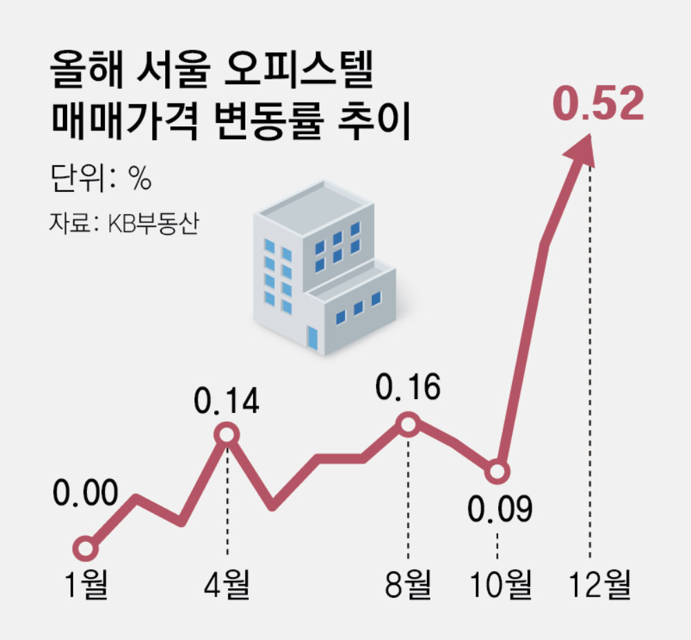 30일 KB부동산에 따르면 서울 오피스텔 매매가는 전월(0.37%)보다 0.52% 오른 것으로 집계됐다. 2022년 5월(0.79%) 이후 3년 7개월 만에 가장 큰 폭으로 올랐다.