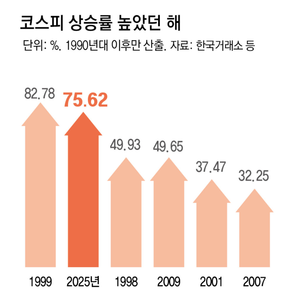 국내 증시가 ‘바이 코리아(Buy Korea) 펀드’ 매입 열풍이 불었던 1999년 이후 가장 높은 상승률을 기록한 뒤 올해 마지막 거래를 마쳤다. 장중에 삼성전자 주가는 12만 원을 넘어서고 SK하이닉스도 65만 원을 넘겼다. 인공지능(AI) 데이터센터 수요 확대로 2026년에도 반도체 기업의 성장이 예상되는 만큼 코스피 상승세가 이어질 것이라는 전망이 우세하다.