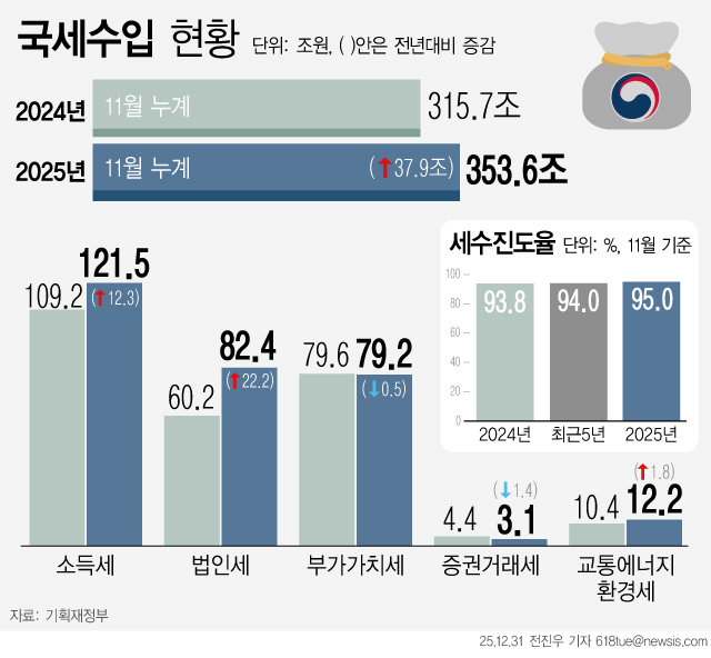 기획재정부가 31일 발표한 ‘2025년 11월 국세수입 현황’에 따르면, 올해 1~11월 누계 국세수입은 353조6000억원으로 전년 같은 기간보다 37조9000억원 증가했다.