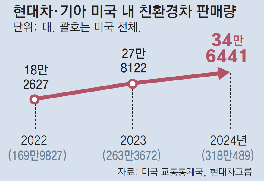 특히 전기차와 하이브리드 등 친환경 차량에 주력한 현대차의 전략이 현지 시장에서 효과적이었던 것으로 풀이된다. 미국 교통통계국(BTS)에 따르면 2022년 대비 2024년 미국 시장에서 친환경차 판매량은 87.1% 증가했다. 이 기간 현대차그룹의 친환경 차량 판매도 89.7% 늘었다.