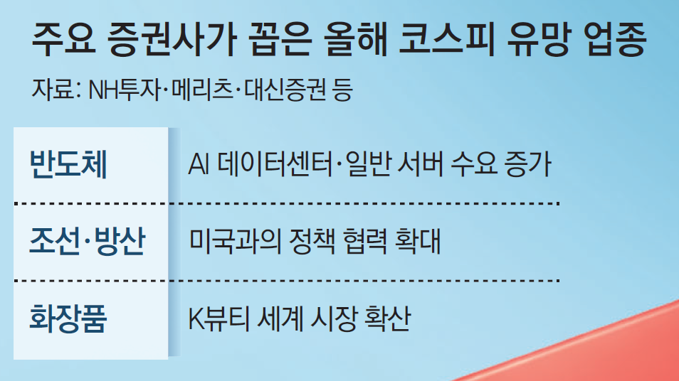 주요 증권사들은 올해 코스피 상승세도 반도체 기업이 좌우할 것이라는 점에 동의했다. AI 데이터센터와 일반 서버에 필요한 반도체 제품 수요 증가로 삼성전자, SK하이닉스 등의 수출이 증가하고 영업이익도 대폭 늘어날 것이란 분석이 나온다. 이수정 메리츠증권 연구원은 “고대역폭메모리(HBM) 제품이 AI뿐만 아니라 일반 서버에서도 활용되기 시작하면서 수요가 빠르게 늘어나고 있다”며 “메모리 반도체의 초호황기는 장기화할 가능성이 높다”고 했다.