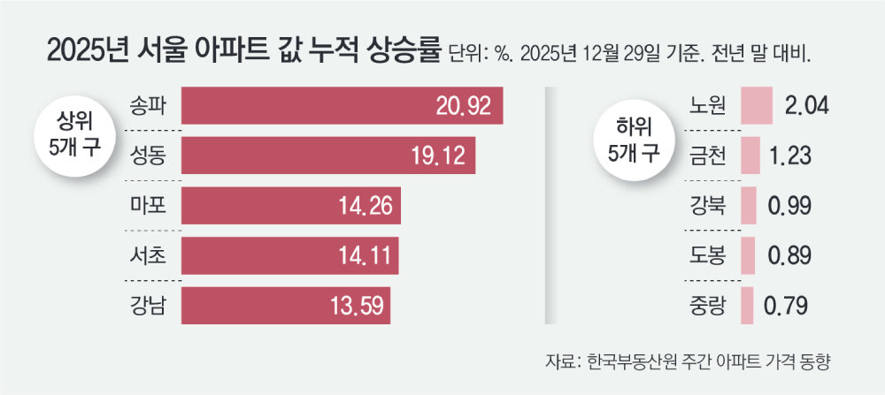 구별로는 송파구, 성동구 외에도 ‘똘똘한 한 채’로 불리는 고가 아파트가 많은 마포구(14.26%), 서초구(14.11%), 강남구(13.59%), 용산구(13.21%) 순으로 올랐다. 반면 강북구(0.99%), 금천구(1.23%) 등 중저가 단지가 몰린 지역은 사실상 제자리걸음 수준이었다.