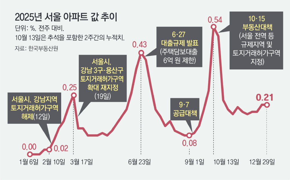 2025년 서울 아파트값이 지난해 2월부터 47주 연속 상승하며 19년 만에 최대로 올랐다. 송파구(20.92%), 성동구(19.12%) 등 강남권과 ‘한강벨트’ 집값이 서울 전체(8.71%)의 2배 이상으로 뛰며 전체 상승세를 이끌었다는 분석이 나온다. 반면 중랑구(0.79%), 도봉구(0.89%) 등 서울 외곽은 1%에도 못 미치는 상승률을 보였다. 올해 서울의 아파트 입주 물량이 지난해보다 30%가량 줄어드는 등 공급 부족이 지속될 가능성이 높아 집값 안정을 위해서는 ‘똘똘한 한 채’ 쏠림을 해소하고 확실한 공급책을 내놔야 한다는 지적이 나온다.