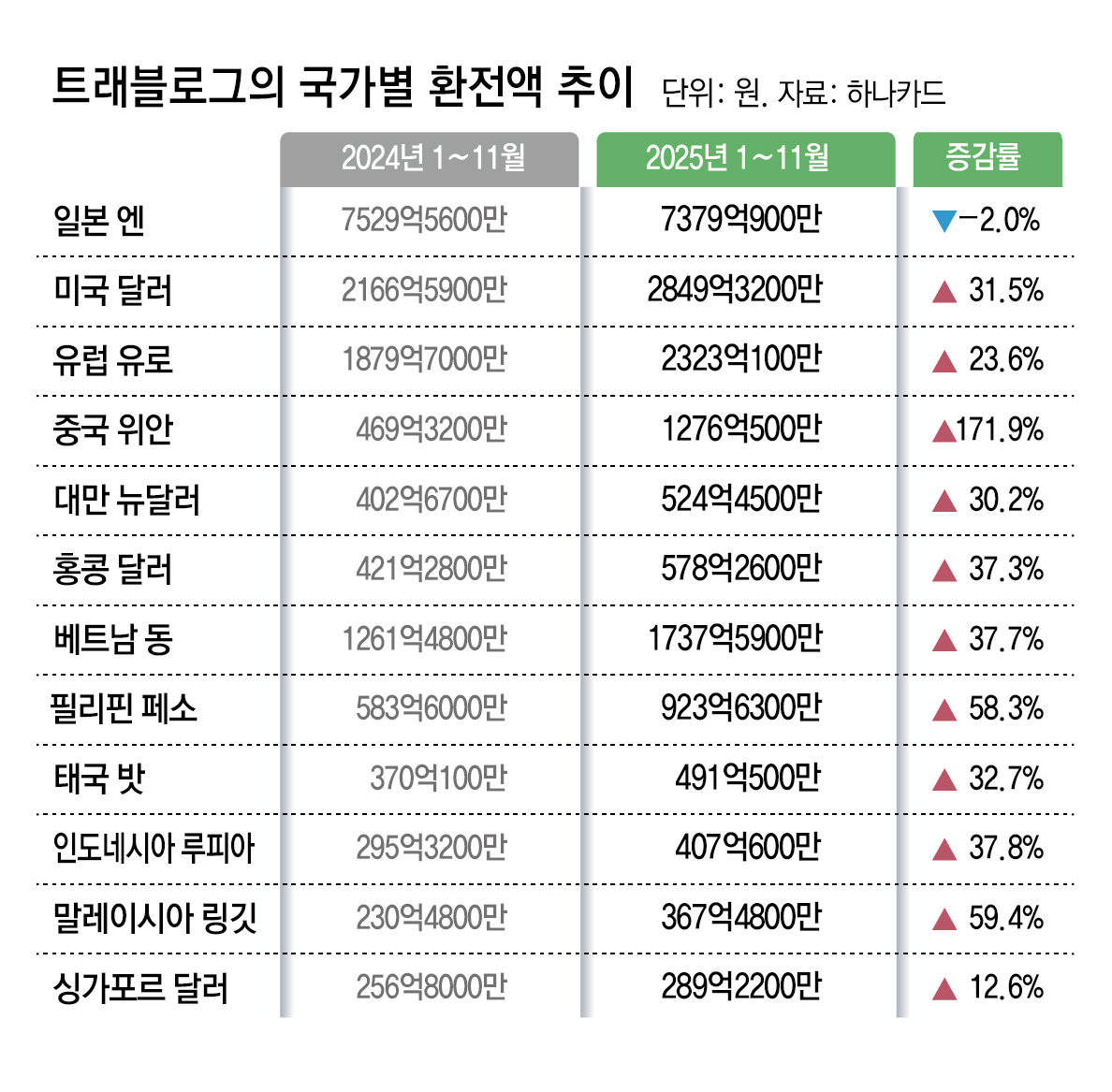 국내에서 가장 많이 쓰는 여행 카드인 하나카드 ‘트래블로그’의 국가별(12개국) 환전액·이용액을 분석해 보면 이처럼 환율이 덜 오른 나라를 여행지로 삼는 분위기를 엿볼 수 있다.
