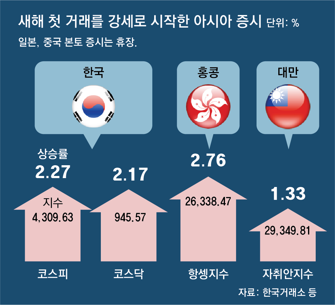 2일 코스피는 전 거래일 대비 2.27%(95.46) 오른 4,309.63으로 마감했다. 종가 기준 4,300을 넘어선 건 처음이다. 코스피는 장중 4,313.55까지 상승하며 장중 고점 신기록도 세웠다. 전 거래일보다 2.17%(20.10) 상승한 코스닥은 945.57로 마감했다. 새해 첫 거래일 코스피가 사상 최고치를 달성한 것은 이번이 다섯 번째다. 가장 최근에는 동학개미 열풍이 불며 국내 주식 ‘사자’ 분위기가 강했던 2021년 1월 4일(2,994.45)이다.