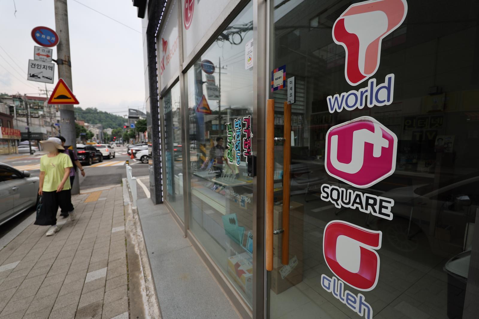 SK텔레콤 사이버 침해 사고 위약금 면제 기한이 하루 앞으로 다가온 13일 서울 서대문구의 한 휴대전화 판매점에 이동통신 3사 로고가 붙어 있다. 이번 사고로 촉발된 이통 3사간의 고객유치전이 막바지로 치달으며 보조금 경쟁 등 과열양상을 띄고 있다. 2025.07.13. [서울=뉴시스]