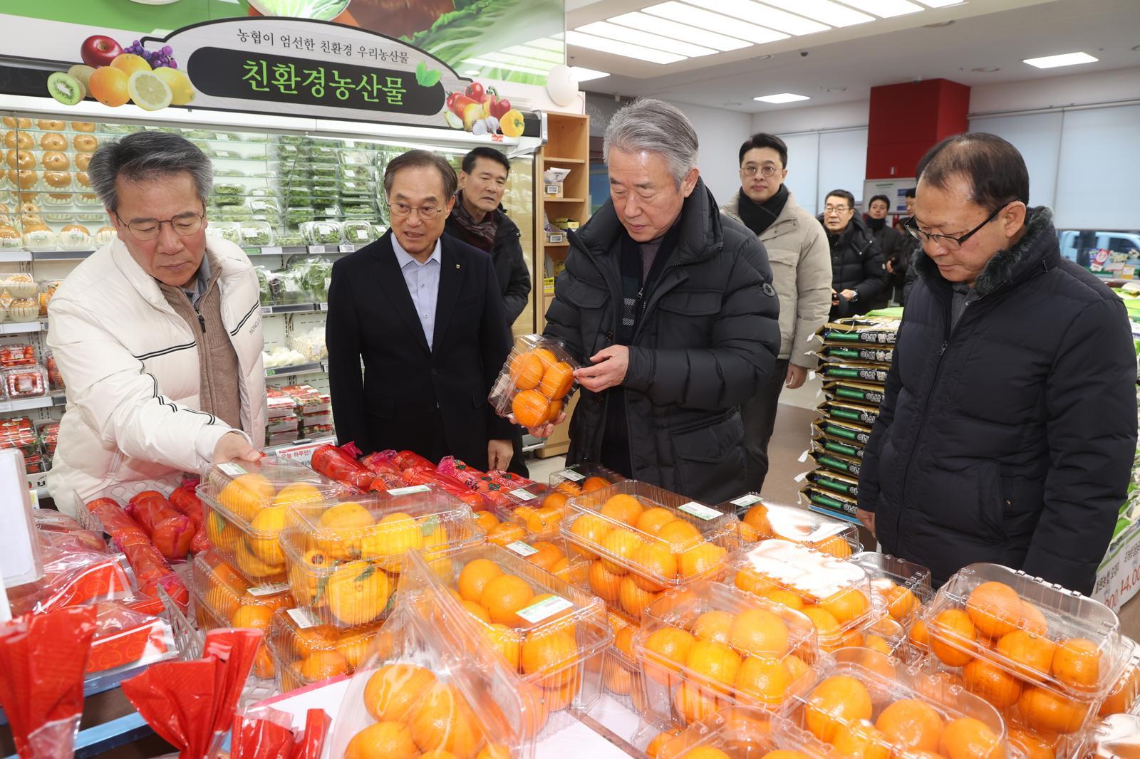 신년을 맞아 강호동 농협중앙회장(왼쪽에서 3번째)이 서서울농협 하나로마트 매장을 방문해 친환경 농산물을 점검하며 물가 동향을 살펴보고 있다. 농협중앙회