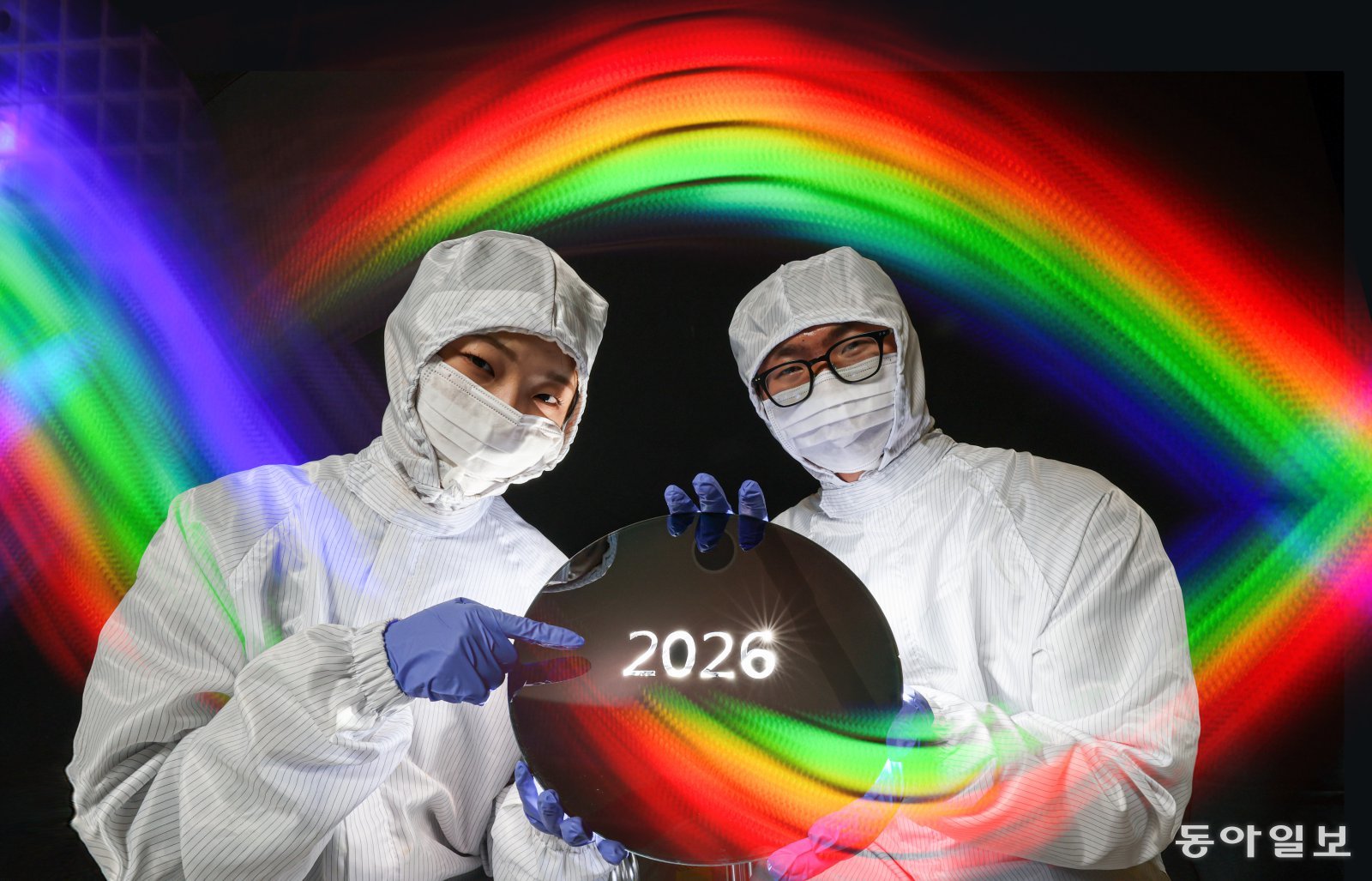 한양대 반도체 공정실습 클린룸에서 반도체공학과 2학년 정재형(20, 왼쪽), 박민진(20)씨가 반도체 산업의 발전과 취업 성공을 희망하며 ‘2026’을 새긴 웨이퍼를 들고 섰다. 인공지능(AI)이 촉발한 반도체 수요 폭증은 올해도 이어질 전망이어서 차세대 반도체 인력 양성의 중요성도 점점 커지고 있다.