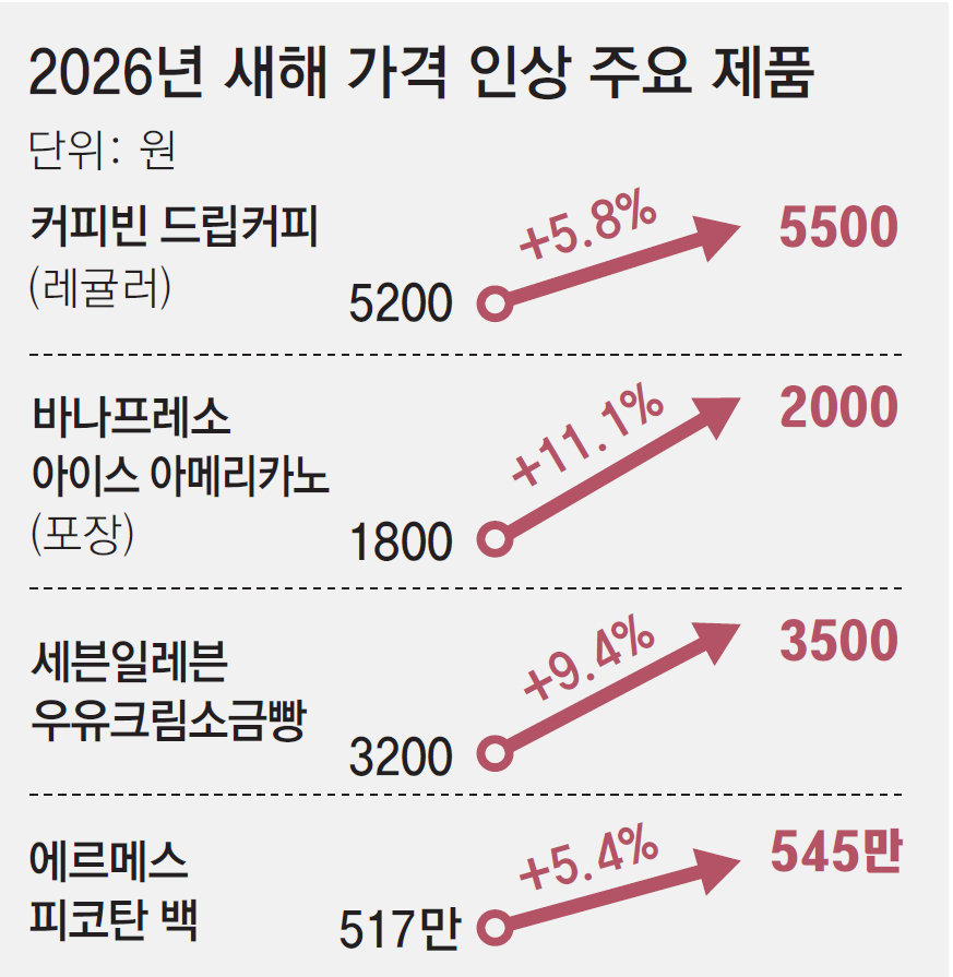 새해 들어 커피 프랜차이즈 업체들이 고환율을 이유로 주요 제품 가격을 200∼300원씩 인상하고 나섰다. 편의점과 명품 업체들도 일부 제품 가격을 줄줄이 올리면서 소비자 부담을 키우고 있다.
