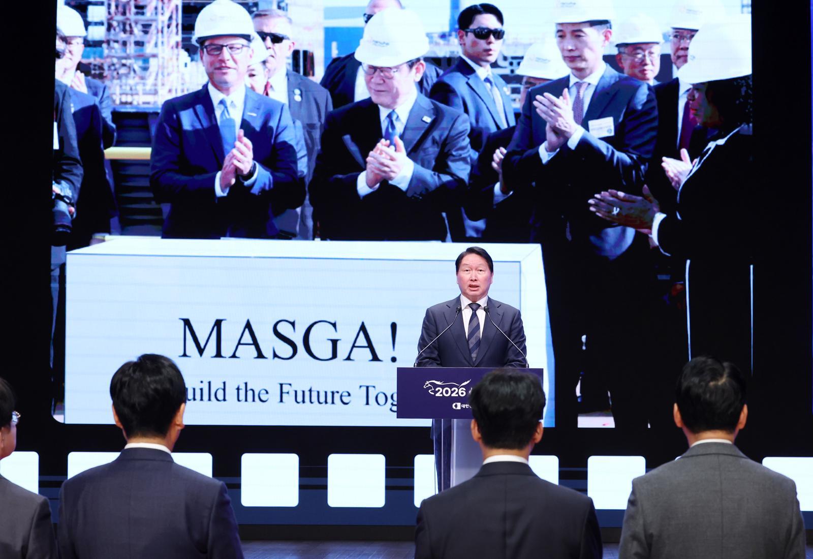 최태원 대한상공회의소 회장이 2일 오후 서울 중구 대한상공회의소에서 열린 2026 경제계 신년인사회에서 인사말하고 있다. 2026.1.2/사진공동취재단