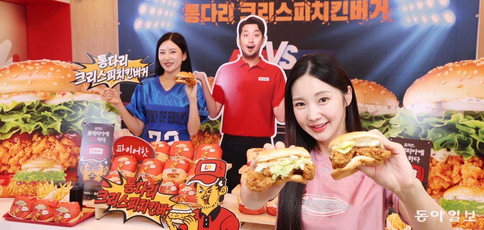 6일 서울 용산구 롯데리아 숙대입구역점에서 모델이 롯데리아의 신제품 ‘통다리 크리스피 치킨 버거’를 소개하고 있다. 이번 신제품은 그릭랜치와 파이어핫 등 두 가지 맛으로 출시됐다. 가격은 단품 기준 6900원이다. 닭고기 통다리살 패티에 쌀가루와 버터밀크를 더해 바삭한 식감이 강조됐다.