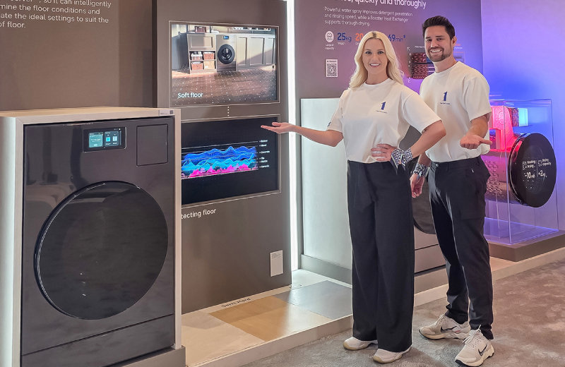 미국 라스베이거스에서 열리는 세계 최대 가전·정보기술(IT) 전시회 ‘CES 2026’에 마련된 삼성전자 단독 전시관에서 삼성전자 모델들이 ‘비스포크 AI 콤보’ 세탁건조기를 소개하고 있다. 삼성전자 제공
