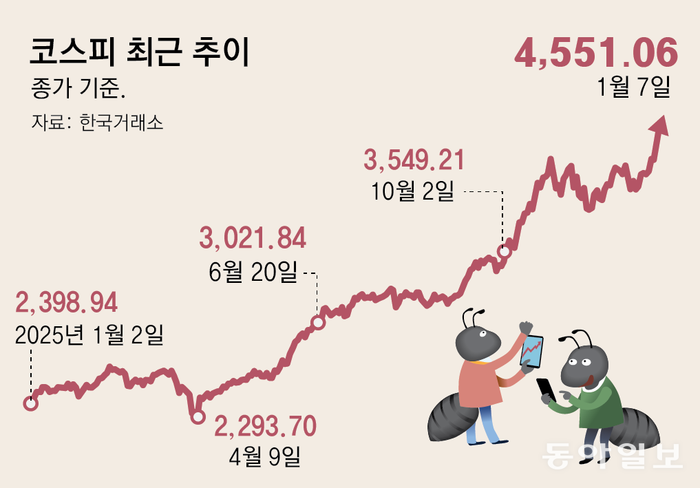 지난해 4월 관세전쟁의 여파로 2,300 선이 깨졌던 코스피가 불과 9개월 만에 두 배로 뛰었다. 미국과 중국의 치열한 인공지능(AI) 패권 경쟁에서 존재감이 커진 반도체의 영향 때문이다. 조선, 방산, 원자력, 로봇 등 한국 기업의 경쟁력이 재조명된 것도 긍정적으로 작용했다. 전날까지 코스피가 3거래일 연속 100단위 숫자를 올리며 빠르게 치솟고, 증권사들이 올해 코스피 전망치를 올리자 투자 심리도 탄력을 받은 것으로 보인다.