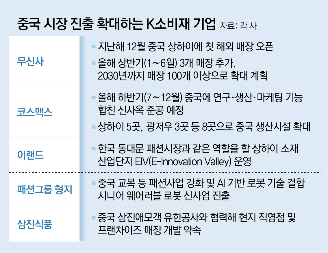 K소비재 기업들이 한중 관계 회복에 맞춰 중국 시장 진출에 본격적으로 시동을 걸고 있다. 한중 정상회담을 계기로 한한령(限韓令·한류 제한 조치) 완화 등이 기대되면서 세계 2위 소비시장인 중국에서 새로운 성장 동력을 찾으려는 의지를 보이고 있다. 패션, 뷰티, 식품 등 최근 중국 진출에 나선 기업들은 확실한 경쟁력을 내세워 앞서 중국에 진출했다가 고배를 마신 아픔을 반복하지 않겠다는 각오를 보이고 있다.