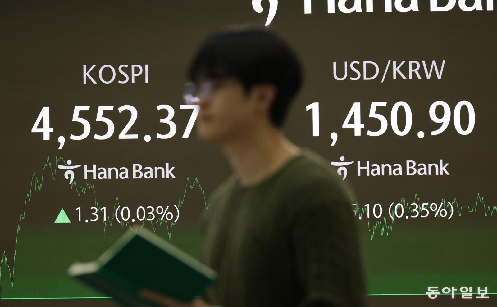 8일 오후 서울 중구 하나은행 본점 딜링룸 전광판에 증시 종가 시황이 나타나고 있다. 이날 코스피 지수는 전거래일 대비 1.31(0.03%) 포인트 상승한 4,552.37로, 코스닥지수는 3.33(0.35%)포인트 하락한 944.06으로 장을 마감했다. 한편 원달러 환율은 5.10(0.35%)원 상승한 1,450.90을 보이고 있다. 변영욱 기자 cut@donga.com