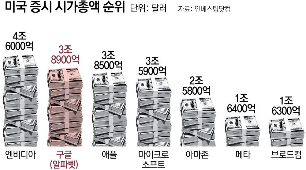 7일(현지 시간) 뉴욕 증시에서 알파벳 A주는 전 거래일보다 2.4% 오른 321.98달러에 마감했다. 알파벳 A와 달리 의결권이 없는 알파벳 C주 역시 2.51% 상승한 322.43달러에 거래를 마쳤다. 알파벳 주식 2종을 더한 구글 시총은 3조8912억 달러(약 5644조 원)로 애플(3조8470억 달러)을 앞섰다. 이날 종가 기준 시총 1위는 엔비디아(4조5969억 달러)였다.