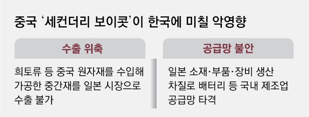 중국이 ‘이중용도 물자 대(對)일본 수출 금지’에 이어 제3국을 통한 우회 수출까지 차단하는 ‘2차 제재’(세컨더리 보이콧) 방침을 내놓으면서 한국 산업계에도 불똥이 튈 조짐이 나타나고 있다.
