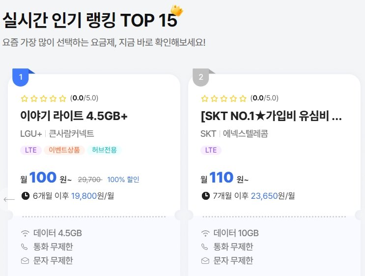 9일 알뜰폰 종합 정보 플랫폼 ‘알뜰폰 허브’에 따르면 이날 오전 11시 현재 실시간 인기 랭킹 5위권 중 3개가 100원 안팎의 요금제다.