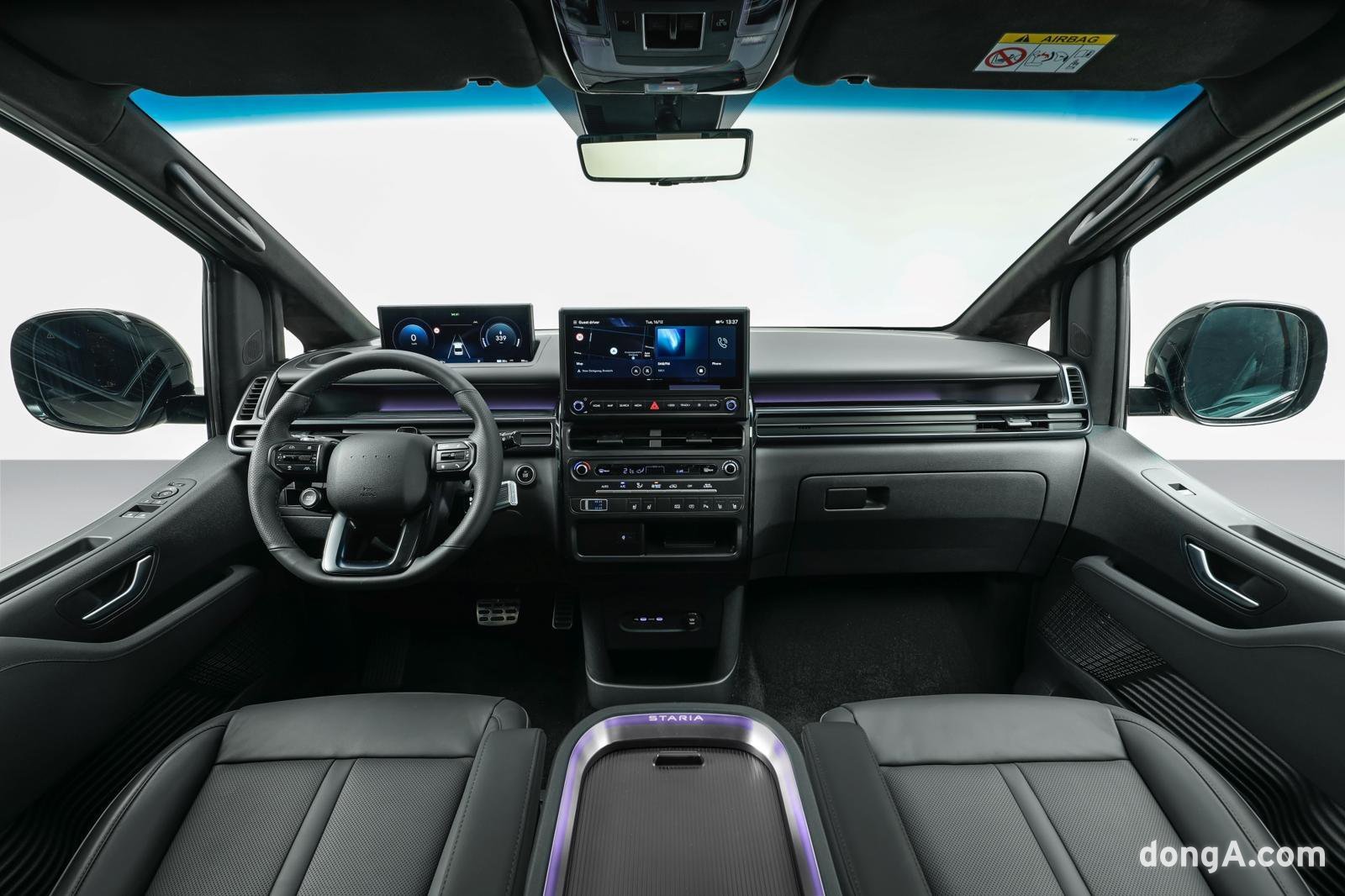 더 뉴 스타리아 EV의 외관은 전기차 전용 디자인 요소를 반영해 미래적이고 간결한 인상을 구현했다.전면부에는 수평형 연속 LED 주간주행등(DRL)이 적용돼 하이테크 감각을 살렸으며, 냉각 공기 흐름을 제어하는 외장형 액티브 에어 플랩(공기 유입 조절 장치)을 도입해 효율적인 온도 관리와 정제된 외형을 동시에 확보했다.