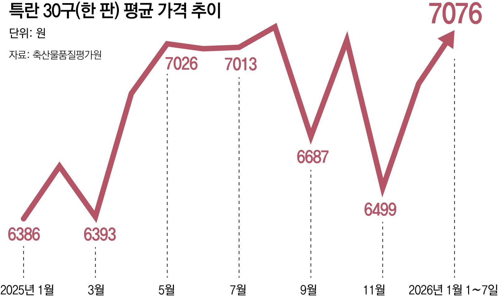 7일 축산물품질평가원에 따르면 5일 현재 특란(60∼67g) 30구(한 판) 평균 소비자 판매가격은 7045원으로집계됐다.1년전(6206원)보다 13.5% 오르면서 같은 기간 소비자물가지수 상승률(2.1%)을 크게 웃돌았다. 올해 들어 평균 가격은 7081원으로 2023년(6491원), 2024년(6562원)부터 지난해(6789원) 연평균 특란 한 판 가격이 6000원대였던 걸 고려하면 높은 수준이다.