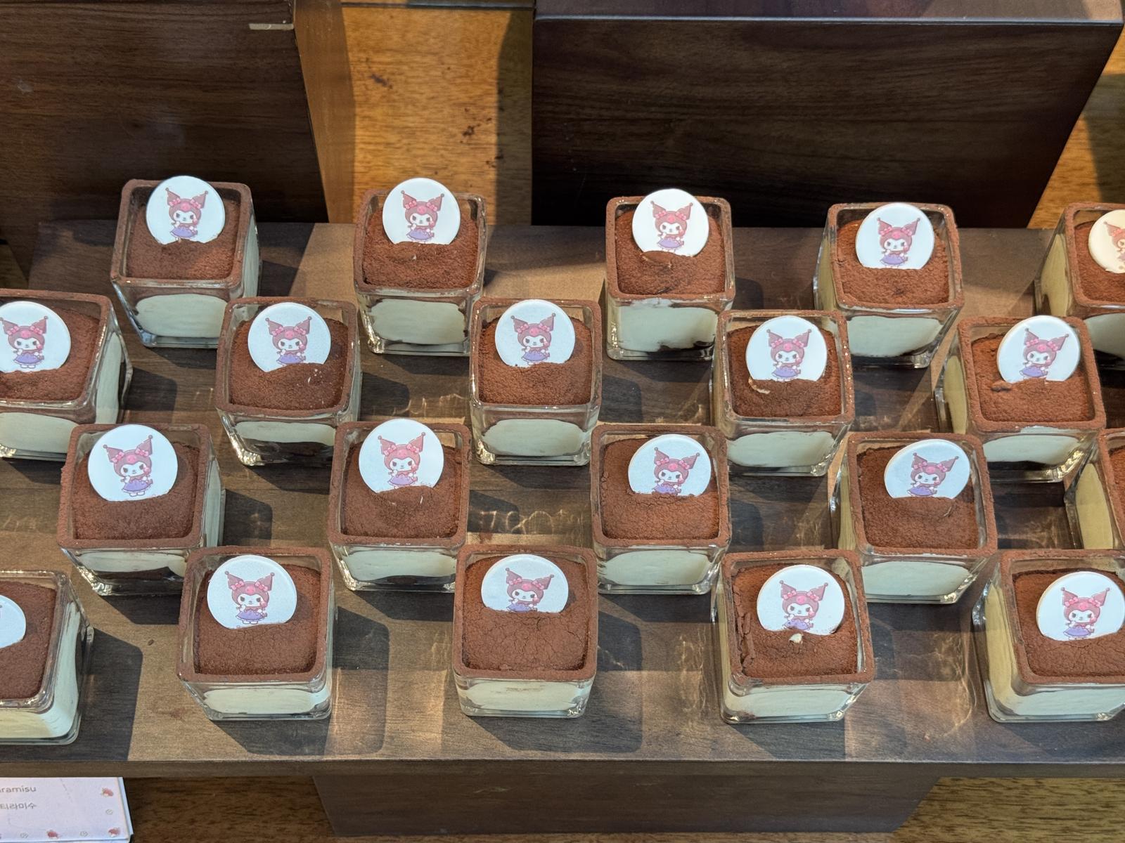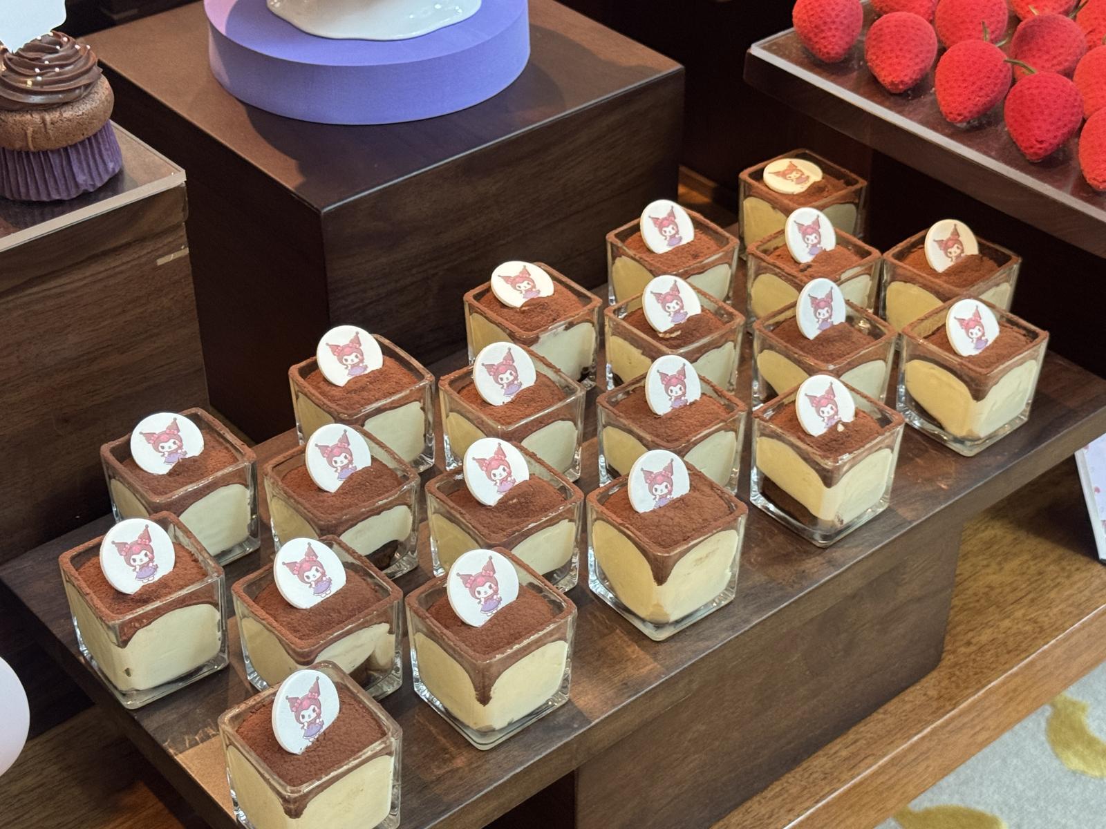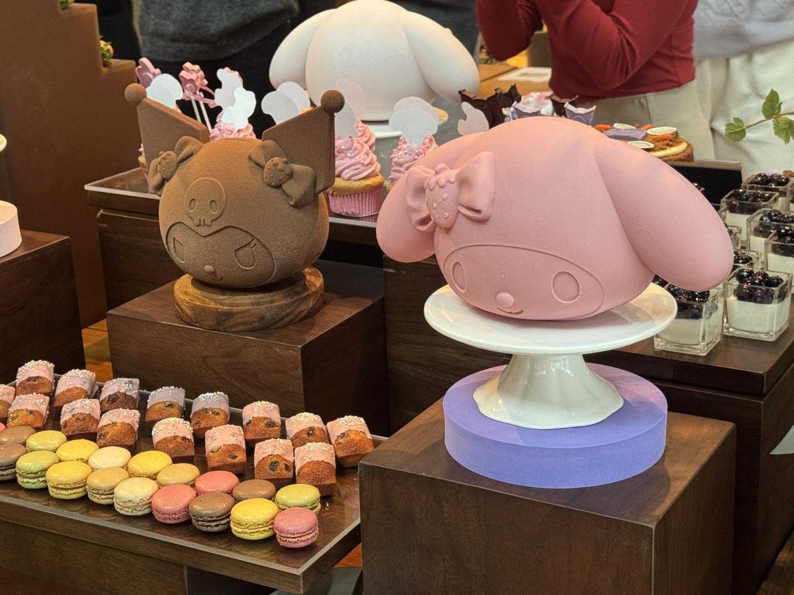 장식 뿐 아니라 메뉴도 캐릭터와 협업했다. 디저트 위에는 쿠로미와 마이멜로디 장식이 하나하나 올라가 있고 메뉴 구성도 콘셉트에 맞췄다. 쿠로미 무스 케이크, 마이멜로디 초콜릿, 보라색 쿠로미 음료 등을 맛볼 수 있다. 보기용으로만 만든 디저트가 아니라 실제로 접시에 담는 메뉴다.