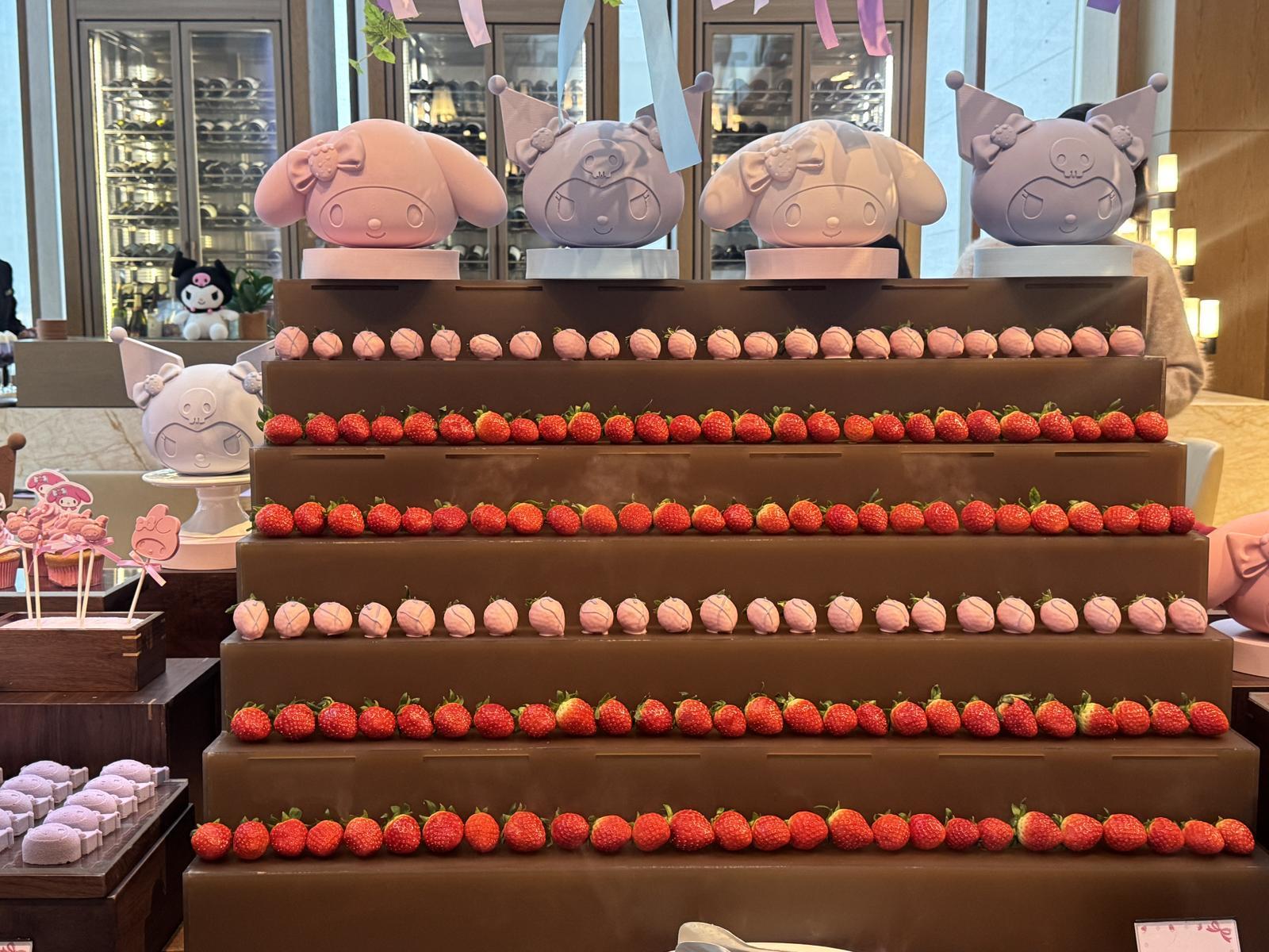 콘래드 서울은 9일 아트리오에서 산리오 협업 딸기뷔페를 앞서 공개했다. 입구 정면부터 거대한 딸기 타워 위에 쿠로미와 마이멜로디 얼굴이 올라가 있었다. 초콜릿으로 만든 장식이다. 주변에는 각종 인형들이 놓여 있어 자리에 앉기 전부터 사진부터 찍게 된다.