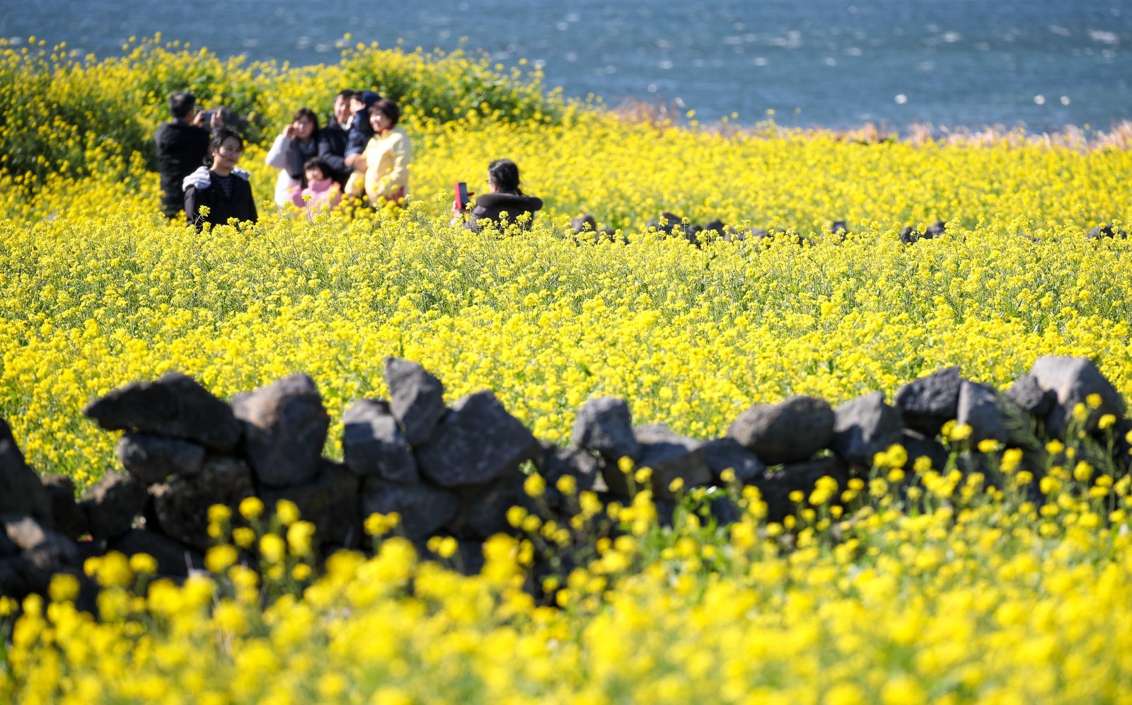 낮 기온이 크게 오르며 포근한 날씨를 보인 14일 오후 제주 서귀포시 성산읍 성산일출봉 인근 유채꽃밭을 찾은 관광객들이 이른 봄꽃을 감상하며 즐거운 시간을 보내고 있다. 2024.01.14 [서귀포=뉴시스]
