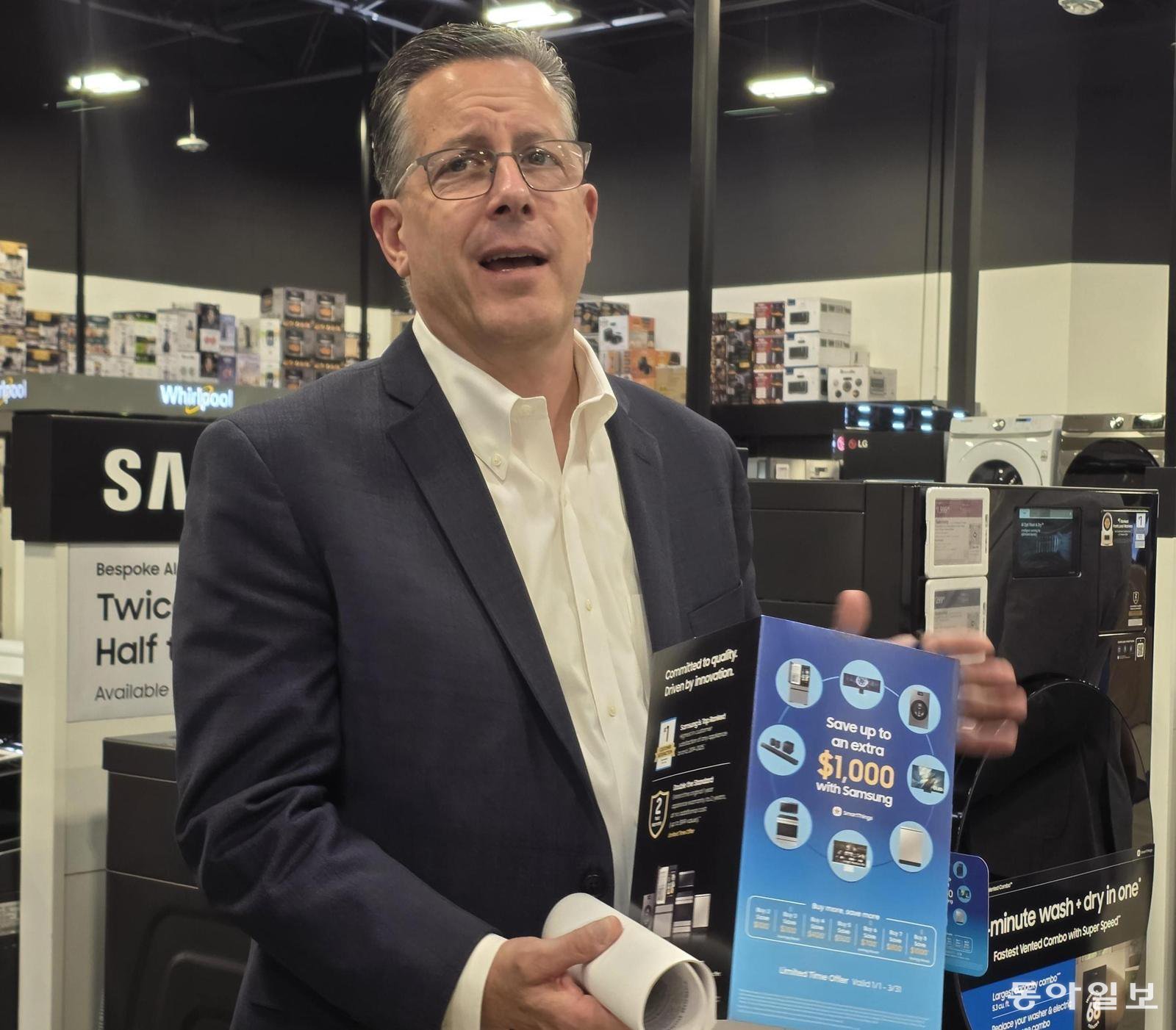 마이클 맥더못 삼성전자 미국법인 CE부문 부사장이 8일(현지 시간) 미국 라스베이거스의 베스트바이 매장에서 삼성전자의 인공지능(AI) 가전에 대해 설명하고 있다. 라스베이거스=이민아 기자 omg@donga.com