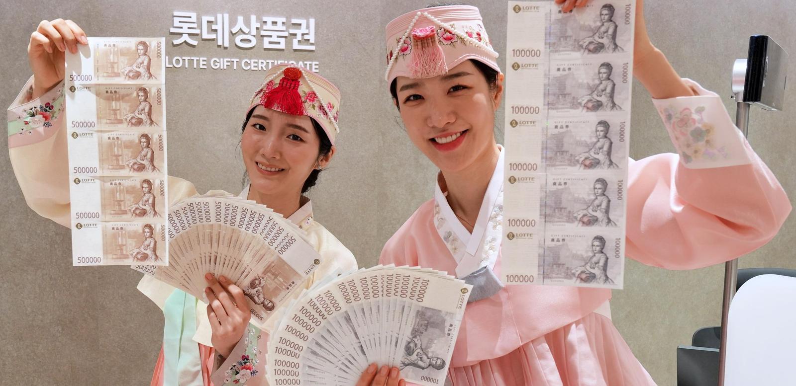 11일 서울 중구 롯데백화점 본점에서 모델들이 상품권을 보여주며 설맞이 행사를 소개하고 있다. 롯데백화점은 12일부터 다음 달 13일까지 상품권 300만 원 이상 구매 시 구매 금액에 따라 1.5∼3.3% 상당의 상품권을 추가 증정하는 행사를 진행한다.