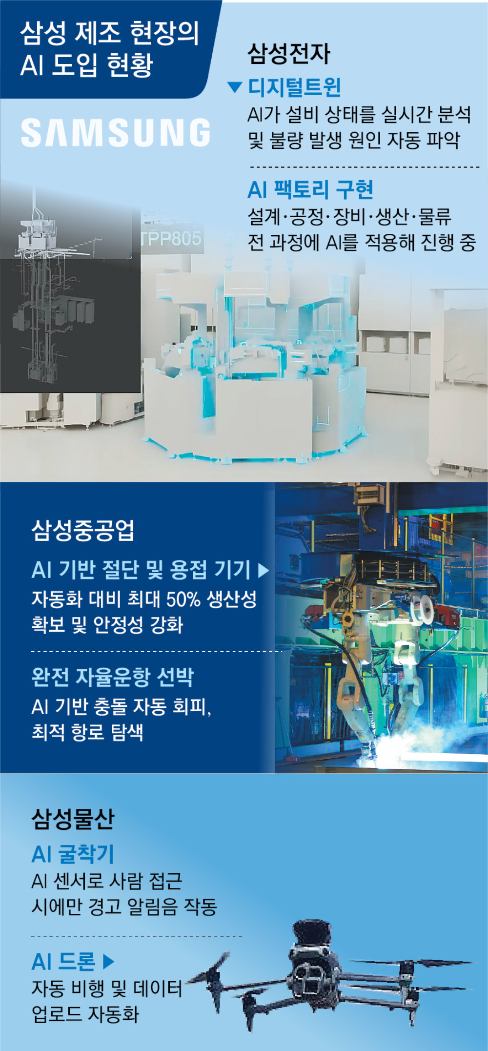 건설 현장에서도 변화가 시작됐다. 삼성물산이 시공 중인 판교 엔씨소프트 RDI센터는 스마트 건설 기술을 집약 적용한 파일럿 현장이다. AI 센서가 부착된 굴착기는 사람과 사물, 구조물을 구분해 사람이 접근했을 때만 경고를 울려 오경보를 크게 줄였다. 외관 촬영용 드론 등도 주목받고 있다. 드론은 정해진 일정에 맞춰 자동 비행하며 데이터를 전송하는 등 100% 자동화됐다. 삼성물산은 향후 내부 촬영도 이 같은 AI 로봇에 맡길 계획이다.