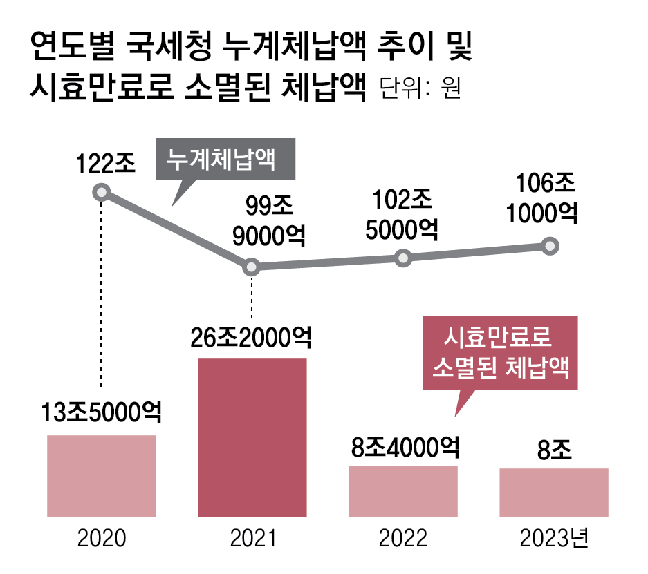 체납액을 줄이기 위해선 세금을 받아내야 했지만 정상적인 방법으로는 목표를 달성하기 어려워지자 국세청은 각 지방청에 장기 압류 재산 및 고액 체납자를 선별하고, 소멸시효 정비를 검토하도록 지시했다. 5억 원 이하는 5년, 5억 원 이상은 10년인 세금의 법정 소멸시효가 지나면 체납 세금이 사라지기 때문이다. 이에 따라 체납 세금 소멸시효 계산 기준을 바꾸는 방식으로 2021∼2023년 동안 1조4268억 원의 세금이 부당하게 탕감됐다.