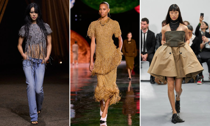 올해 패션계에서는 옷 밑단 술 장식인 ‘프린지’를 활용해 옷을 역동적으로 연출하려는 시도가 이어지고 있다. 알렉산더 맥퀸의 상의(왼쪽 사진), 샤넬의 드레스 소매와 헴라인(가운데 사진), 사카이의 로퍼 등 움직임이 많은 곳에 가미된 프린지가 패션에 생동감을 부여하고 있다. 각 사 제공