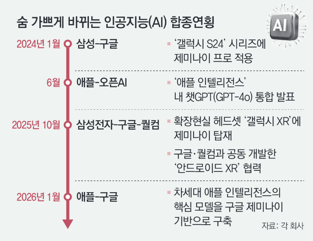 애플이 자사 인공지능(AI) 시스템인 ‘애플 인텔리전스’의 기반 모델로 구글의 ‘제미나이’를 채택했다. 애플이 사실상 자체 AI 개발을 포기하고 외부 빅테크인 구글과 손을 잡는 방안을 선택한 것이다. 심지어 애플과 구글은 스마트폰과 관련해선 라이벌 관계다. 이번 조치에 따라 삼성전자 갤럭시 시리즈부터 애플 아이폰까지 앞으로 나오는 대부분의 스마트폰에 구글 AI가 탑재될 것으로 전망된다.