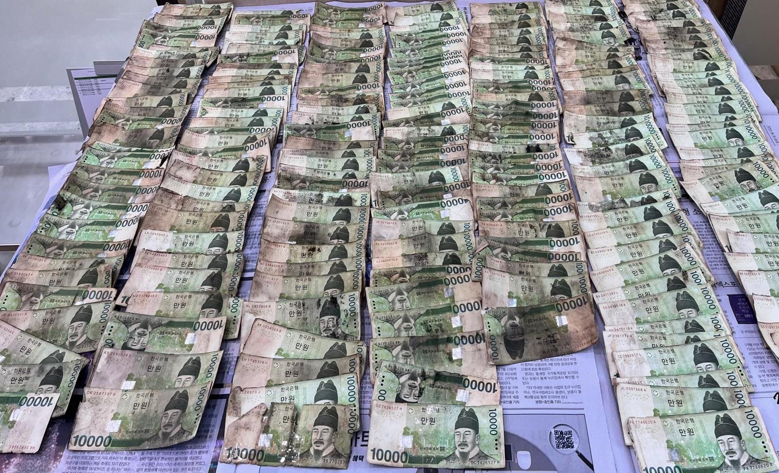 장판에 눌려 열에 그을린 화폐 1만 원권 총 592만 원어치.