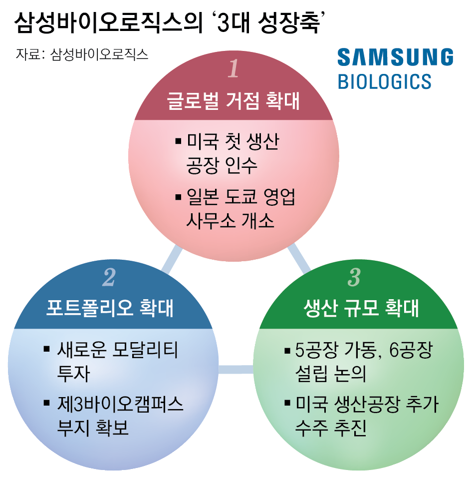 삼성바이오로직스가 미국 메릴랜드주 록빌의 생산 공장 인수를 3월 내에 마무리하고 생산 규모를 확대하는 방안을 검토하고 있다. 인천 송도에는 제3바이오캠퍼스 부지를 마련하고 해당 공장을 삼성전자 협력을 통해 ‘지능형 공장’으로 만들 방침이다.