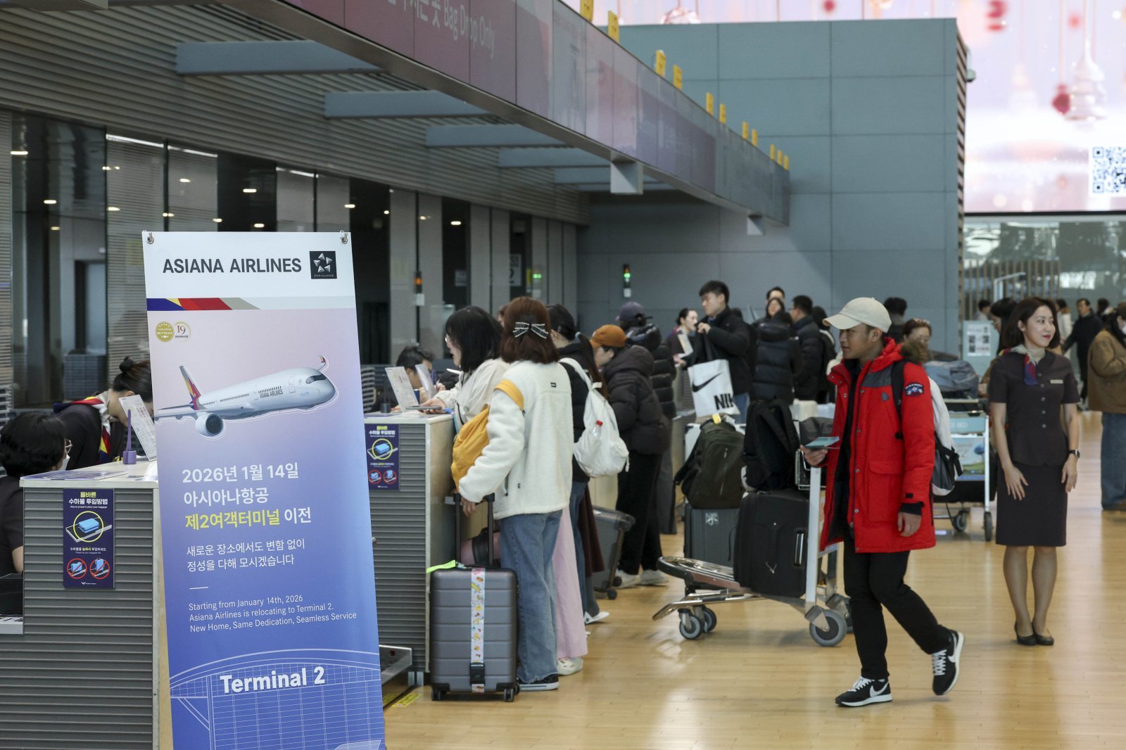 아시아나항공이 인천국제공항 제2여객터미널(T2) 운항을 개시한 14일 오전 인천국제공항 제2터미널에서 여행객들이 탑승 수속을 하고 있다. (공동취재). 2026.01.14.