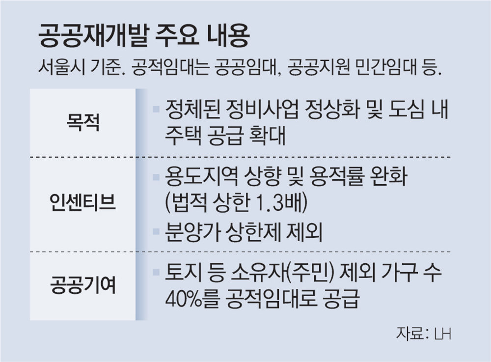 “공공재개발은 말 그대로 공공이 시행을 하는 재개발 사업을 말합니다. 일반적인 재개발은 통상 주민들이 구성한 조합이 시행을 하는데, 조합의 역할을 공공이 대신하는 것이죠. 서울 등 도심 주택 공급 부족 문제를 해결하기 위해 2020년 5월과 8월 등 두 차례에 걸쳐 후보지를 발표했죠. 주민 간 의견 차이나 사업성 부족 등으로 지연되고 있는 재개발 사업에 한국토지주택공사(LH) 같은 공공시행자가 참여해 속도를 높인다는 것이 기본 콘셉트입니다.