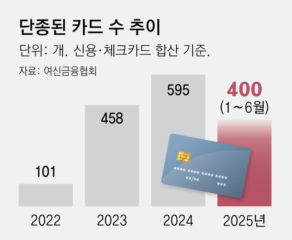 15일 여신금융협회에 따르면 지난해 상반기(1∼6월) 전업 카드사 8곳(신한, 삼성, KB국민, 현대, 롯데, 우리, 하나, BC)에서 단종된 신용·체크카드는 400개였다. 단종된 카드는 2022년 101개, 2023년 458개, 2024년 595개로 불어나고 있다. 카드업계 관계자는 “지난해 연간 단종된 카드 수가 조만간 발표될 예정인데 700개를 상회할 가능성도 있다”고 했다.