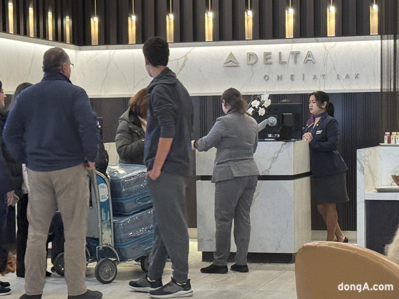LAX 공항 외부와 연결돼 있는 델타 원 라운지. 정진수 기자 델타 원 이용객들은 비행 탑승 절차와 관련된 모든 과정을 이곳에서 해결할 수 있다. 체크인부터 수하물 접수까지 이동 없이 한 번에 진행 가능하다. 일반적으로는 항공사 창구를 찾아 체크인을 하고, 이후 수하물 검사까지 거쳐야 해 상당한 시간이 소요되지만 델타 원에서는 이러한 절차가 일괄 처리돼 고객의 몸과 마음을 한결 가볍게 만든다.