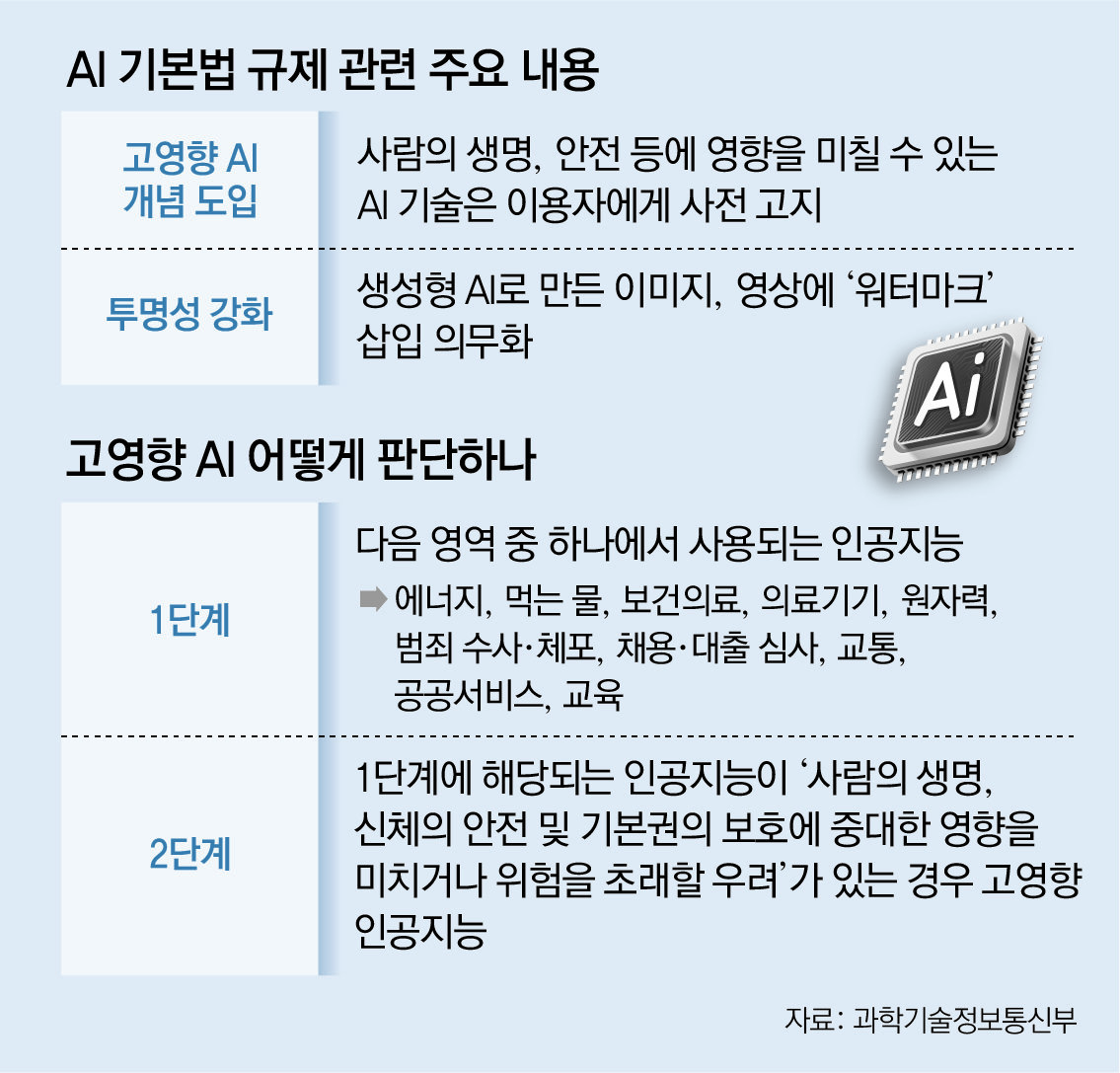문제는 불분명한 기준이다. 대표적인 것이 규제 대상인 고영향 AI 정의다. 법안은 고영향 AI를 ‘사람의 생명, 신체의 안전 및 기본권의 보호에 중대한 영향을 미치거나 위험을 초래할 우려가 있는 인공지능 시스템’으로 규정했다. 영역으로는 에너지, 보건의료, 범죄 수사·체포, 교통 등 10가지로 나눴다. 그러나 업계에선 “‘중대한 영향’의 범위가 불분명하다”는 반응이 나온다. 과기부 관계자는 “수치 등 하나의 기준을 세우기 어렵다”며 “영역별 세부 질문을 담은 흐름도를 통해 고영향 AI 여부를 판단할 예정”이라고 말했다.