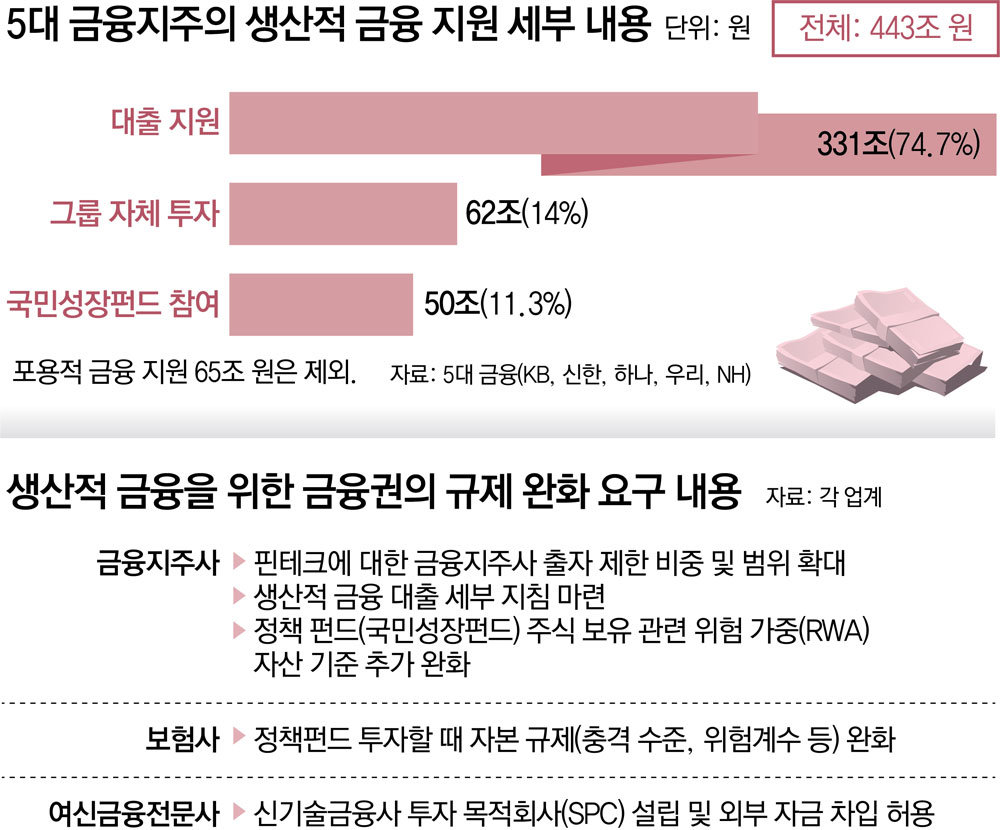 당장 올해부터 5대 금융이 생산적 금융에 441조 원을 투입하기로 한 가운데 ‘생산적 금융’ 분야로 분류되는 74.7%(331조 원)를 차지하는 대출에 대한 세부 지침이 필요하다는 지적도 나온다. 예컨대 데이터센터를 짓는 사람에게 돈을 빌려주면 생산적 금융 대출로 볼 수 있을지 모호하다. 이 사람이 데이터센터를 지은 뒤 센터에서 임대업을 할 수 있기 때문이다. 부동산 대출이 아닌 혁신 산업에 대출하자는 생산적 금융의 취지를 고려하면 이런 경우는 생산적 금융으로 분류할지 애매하다. 한 금융그룹 관계자는 “금융사가 자의적으로 판단했다가 나중에 생산적 금융 여신이 아니라고 판단되면 문제가 생길 수 있다”면서 “금융 당국에서 큰 틀에서의 지침을 제공해야 속도와 실행력이 제고될 것”이라고 말했다.