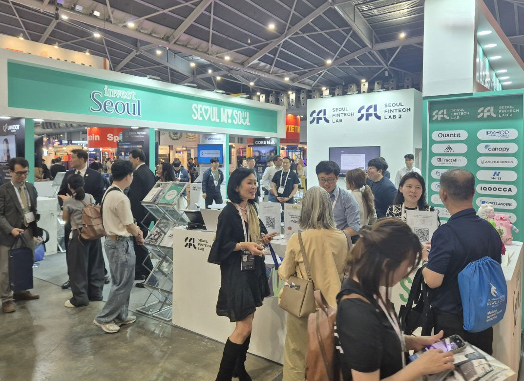 지난해 11월 싱가포르에서 열린 ‘싱가포르 핀테크 페스티벌’에 마련된 ‘서울 핀테크 랩’ 부스. 한국 핀테크 기업 관계자들이 현지인들에게 기업을 소개하고 있다. 서울시 제공