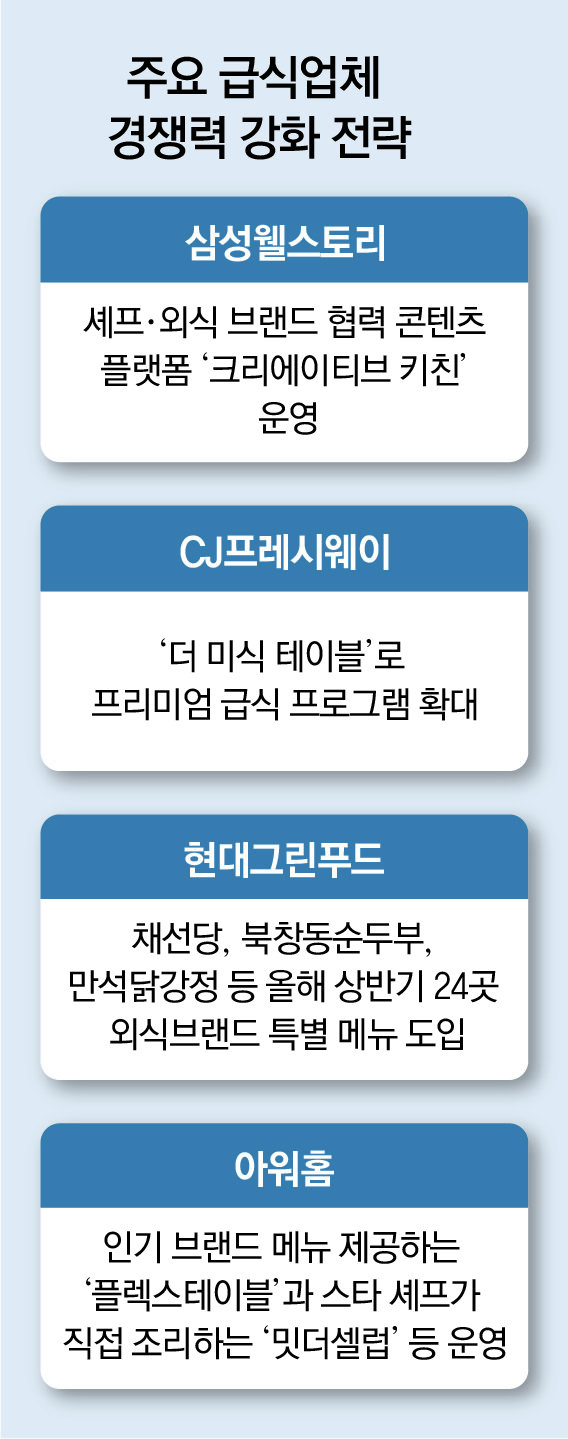 급식업계 관계자는 “런치플레이션으로 구내식당 수요가 늘면서 매출 증대는 물론이고 수익성도 개선되는 추세”라며 “이용객들이 브랜드와 셰프, 콘텐츠까지 접목한 외식형 급식을 선호하면서 빠르게 변신하는 중”이라고 했다.