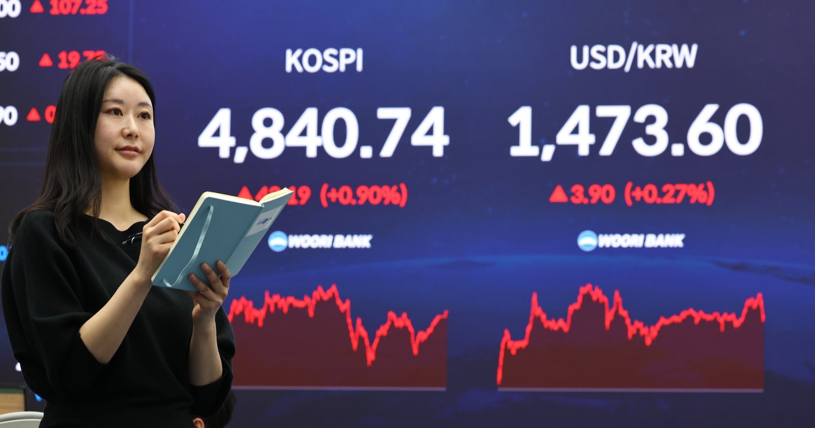 코스피가 전 거래일(4797.55)보다 43.19포인트(0.90%) 상승한 4840.74에 마감한 16일 서울 중구 우리은행 딜링룸에 종가가 보이고 있다. 코스닥 지수는 전 거래일(951.16)보다 3.43포인트(0.36%) 오른 954.59에 거래를 마쳤다. 서울 외환시장에서 원·달러 환율은 전 거래일(1469.7원)보다 3.9원 오른 1473.6원에 주간 거래를 마감했다. 2026.01.16. [서울=뉴시스]