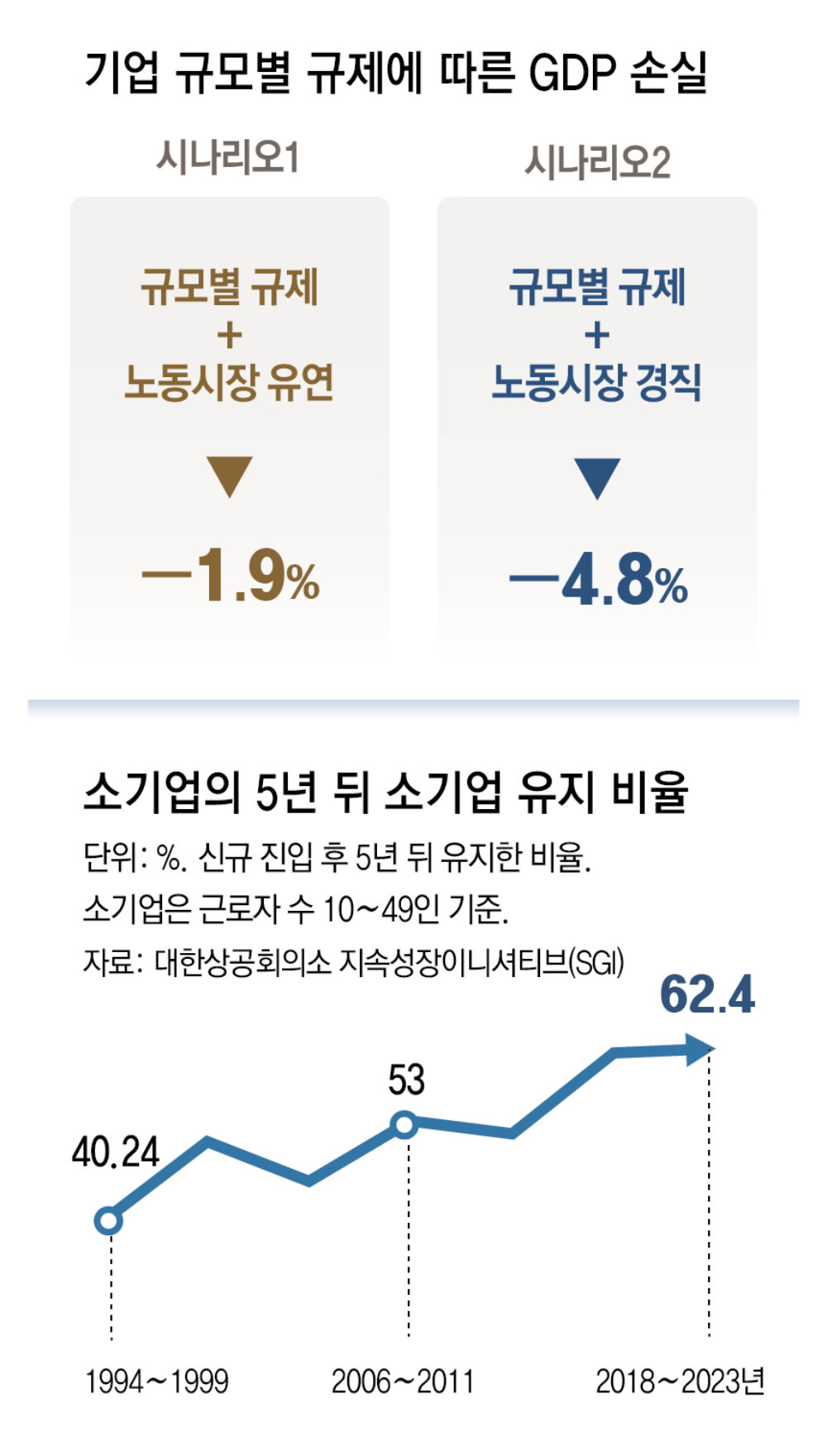 성장 페널티로 인해 발생하는 가장 큰 문제로는 기업들이 인위적으로 성장을 멈추는 ‘안주 전략’이 꼽힌다. SGI는 “기업들이 50인, 300인 등 규제 장벽 앞에서 일부러 안주하는 것이 국가 경제의 활력을 떨어뜨리고 저성장을 가져온다”며 “여기에 노동시장의 경직성까지 더해져 실업이 늘거나 인력 운용의 비효율이 발생해 성장 잠재력이 떨어진다”고 지적했다. SGI는 지금과 같은 규모별 규제를 유지한 상태에서 노동시장만이라도 유연화하면 GDP의 4.8%에 이르는 손실을 1.9%로 줄일 수 있을 것으로 추산했다.