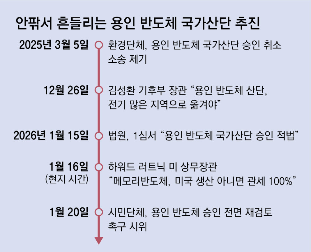 경기 용인 반도체 산업단지 조성을 둘러싼 안팎의 ‘흔들기’가 계속되고 있다. 청와대가 “(반도체 산단의 타 지방) 이전을 검토하지 않고 있다”고 밝힌 데다 법원이 정부의 산단 승인이 적법하다는 판단을 내렸지만 여전히 정치권과 시민단체에선 산단 지방 이전과 승인 취소를 요구하는 목소리가 이어지고 있다. 최근 미국 정부까지 관세 카드로 한국 반도체 기업의 미국 투자를 압박하면서 반도체 투자가 국내에서 제때 이뤄지지 못할 수도 있다는 우려가 나온다.