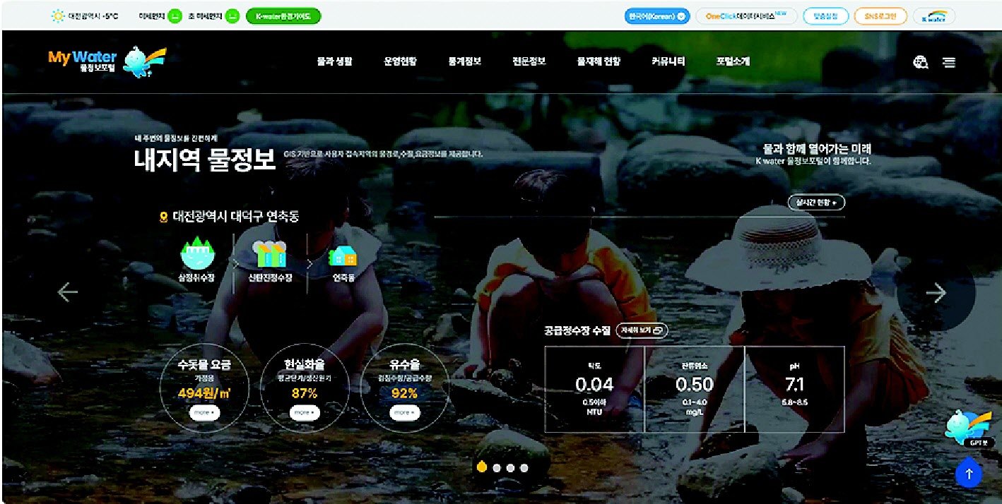 K-water는 1967년 창립 이래 우리나라 물 자원의 효율적 개발·관리를 선도해 왔으며 2016년 물정보포털 MyWater를 구축하며 물 정보를 하나로 모으는 디지털 혁신을 시작했다. 물정보포털은 홍수, 가뭄, 녹조 등 물 재해 정보는 물론 물백과사전, 친수여행, 교육, 학술정보까지 문자, 데이터, 영상, 이미지로 디지털화해 제공한다.