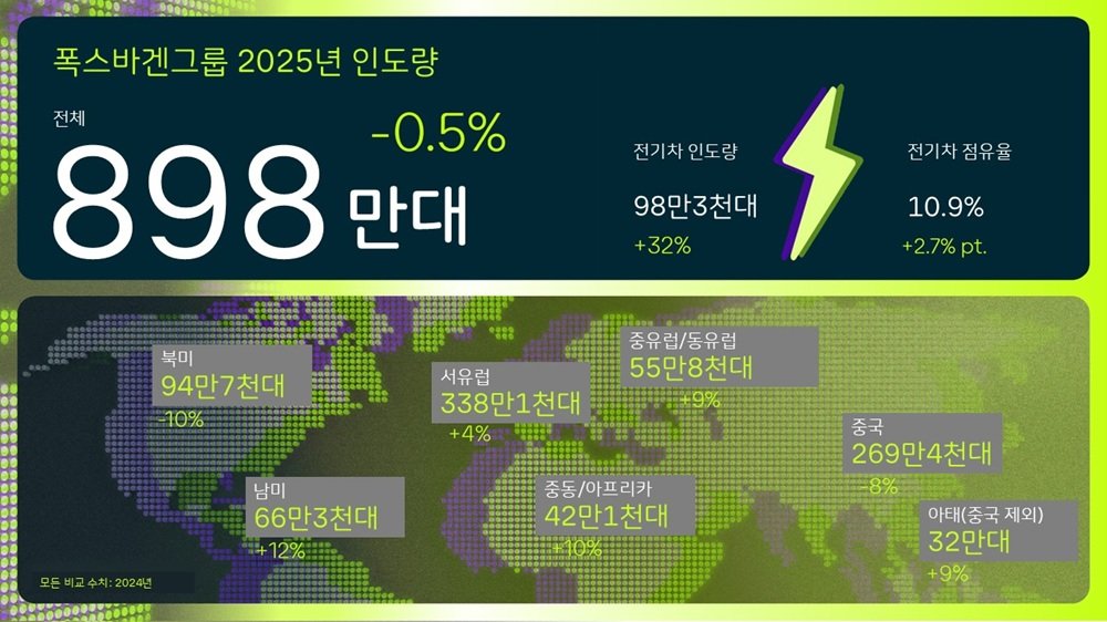 폭스바겐그룹이 지난해 글로벌 자동차 시장의 불확실성 속에서도 전 세계 인도량 898만3900대를 기록하며 전년(902만6700대) 대비 0.5% 감소에 그치는 안정적인 실적을 유지했다. 중국과 북미 시장 부진에도 불구하고, 유럽·남미 성장과 전기차·플러그인 하이브리드의 고성장이 실적 방어에 기여했다는 분석이다.